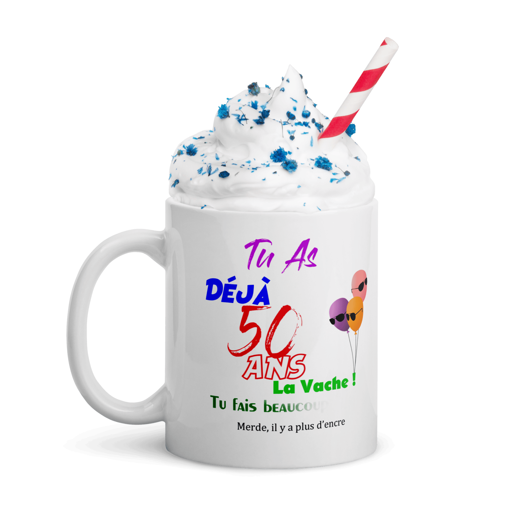 Passer le cap 50 ans en riant, c’est tout le programme de ce mug d’anniversaire. Sur la face avant, la tasse annonce tu as déjà 50 ans, puis lâche la vache comme une exclamation complice. La ligne suivante tu fais beaucoup apparaît avec un beaucoup à moitié effacé, comme si l’imprimante avait perdu son sérieux au moment le plus piquant. La chute merde il y a plus d’encre transforme la scène en gag imprimé prêt pour la table du dessert. Au dos, un grand 50 occupe l’espace, la dizaine dessinée comme une bougie à souffler pour la photo souvenir. Objet de fête et souvenir du jour J, ce mug 50 ans s’invite au toast, circule entre les invités et revient le lendemain au petit déjeuner pour prolonger l’éclat de rire.