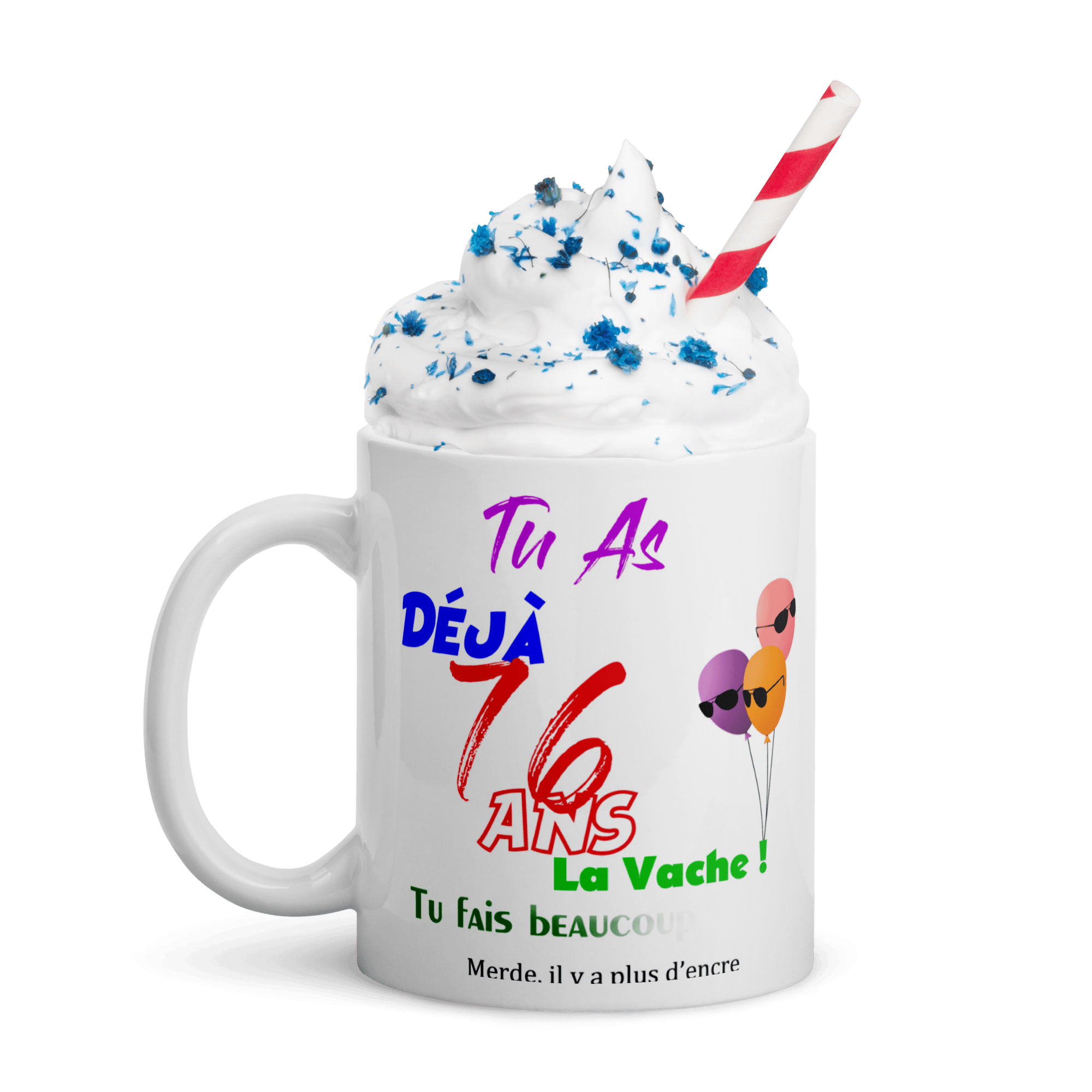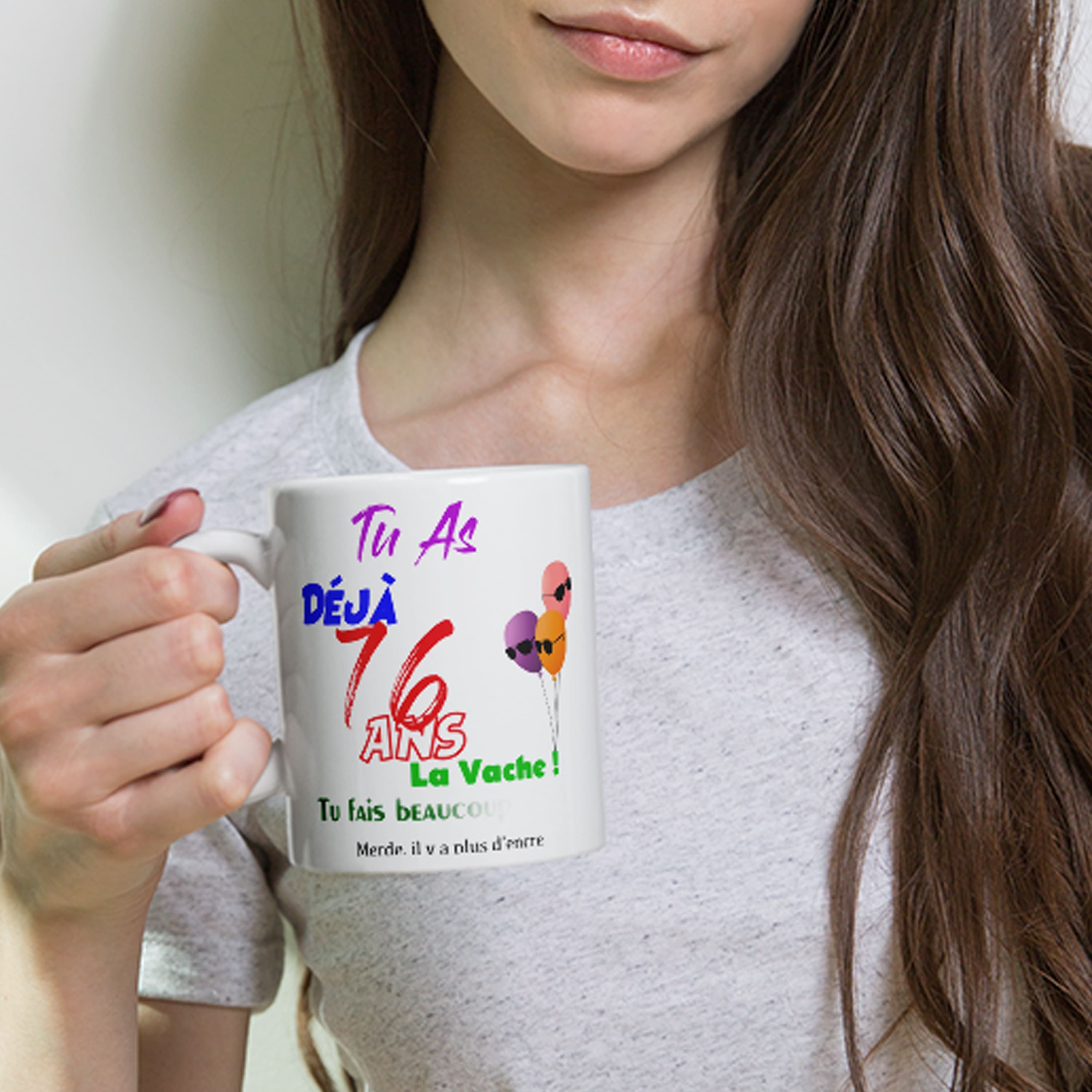 Voici le mug d’anniversaire qui fait rire dès la lecture. Le visuel enchaîne tu as déjà 77 ans puis la vache, comme une exclamation spontanée. En dessous, tu fais beaucoup avec un beaucoup volontairement à moitié effacé laisse deviner la suite, avant la chute merde il y a plus d’encre qui transforme l’ensemble en gag de faux incident. Au dos, un gros 77 s’affiche fièrement, avec le premier 7 stylisé en bougie prête à souffler. Parfait pour un repas en famille, un apéro entre voisins ou une pause café entres amis, ce cadeau pas cher déclenche un sourire immédiat et devient vite la tasse préférée de la journée. On lit, on rit, on trinque, et on recommence.
