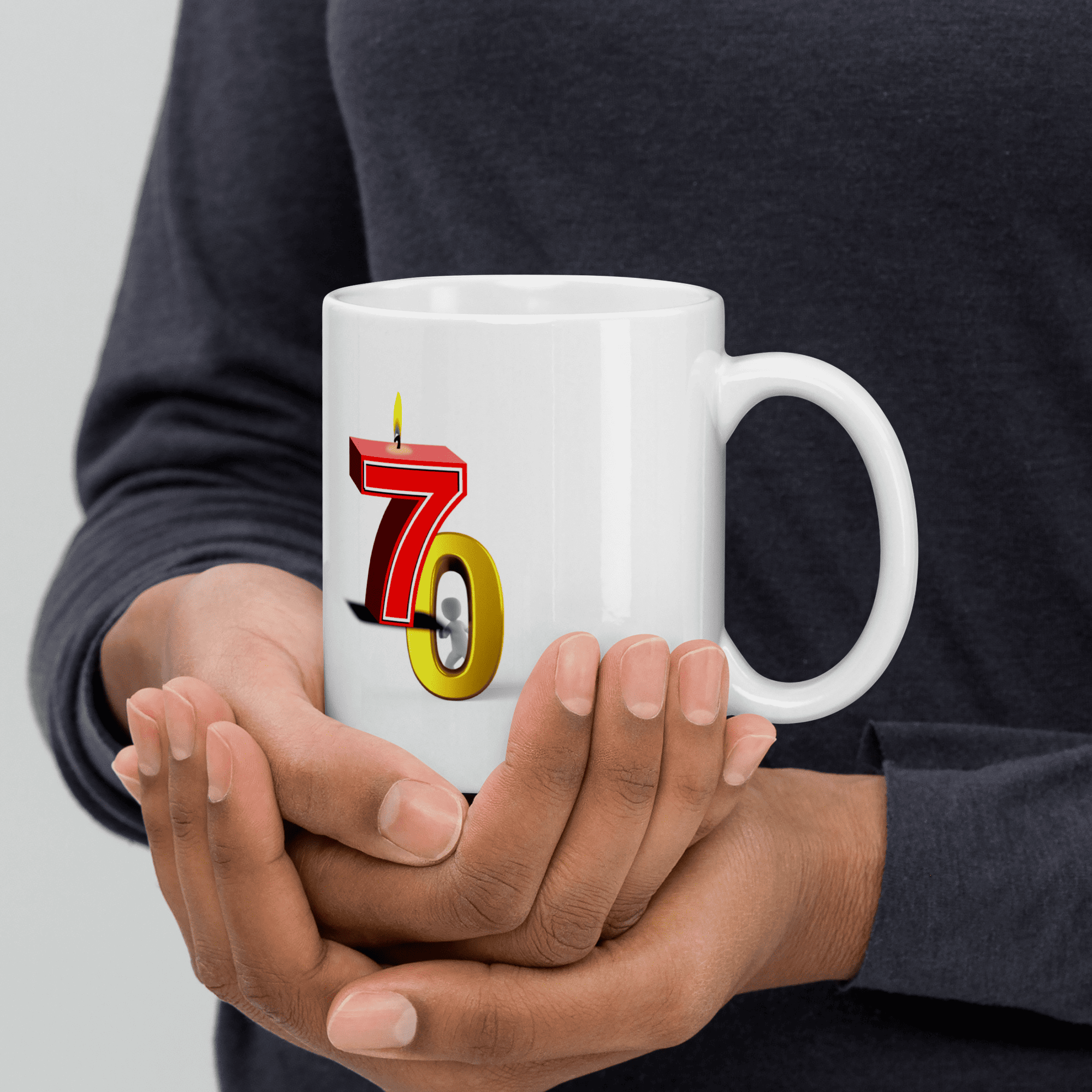 Retournez le mug anniversaire 70 ans et le visuel devient symbole. Un grand 70 occupe la scène, avec la dizaine dessinée comme une bougie qu’on aurait envie de souffler. Ce détail transforme la tasse anniversaire 70 ans en objet totem de la journée. On lève la tasse comme on lève un verre, on sourit, on immortalise l’instant.