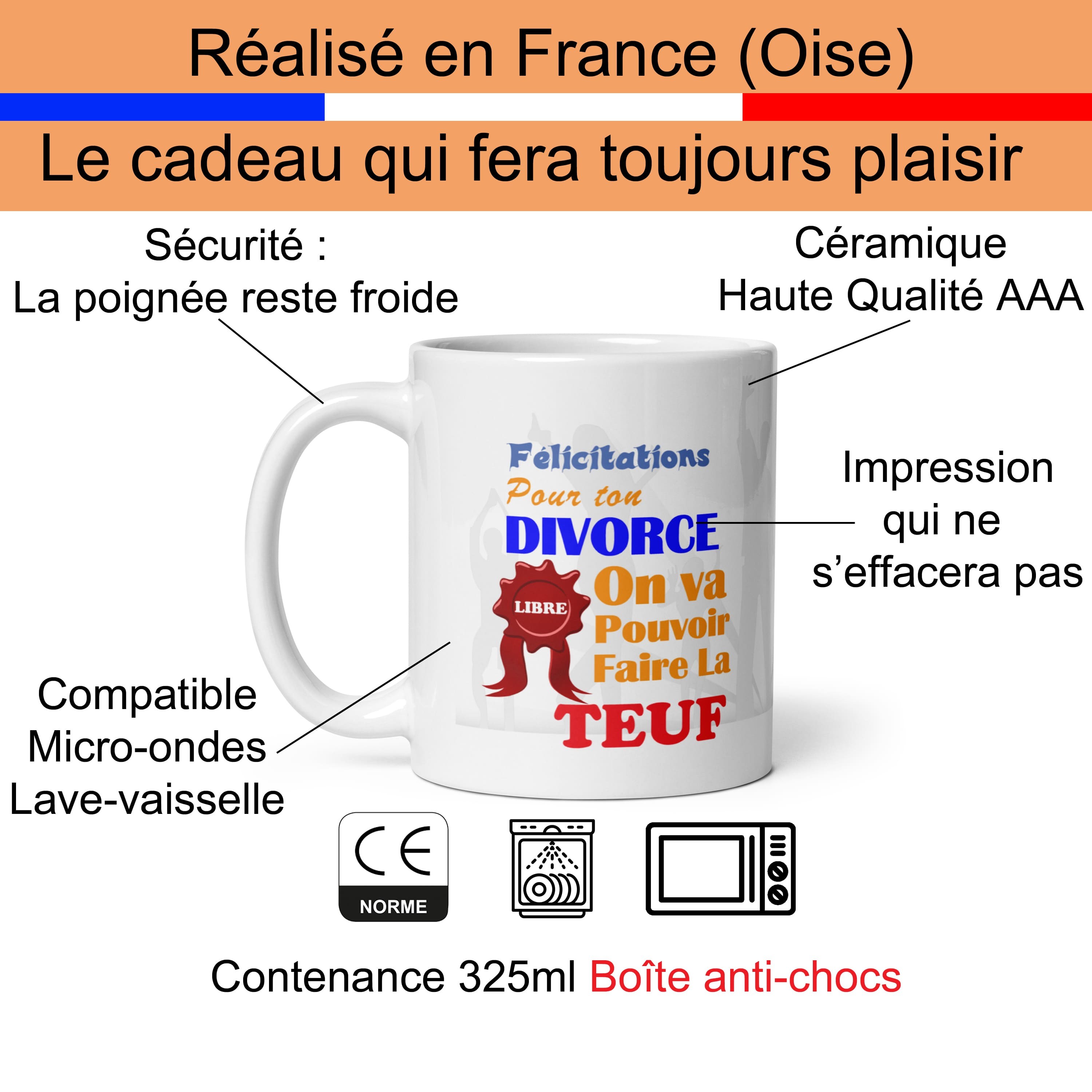 Derrière la blague, un vrai bel objet. Mug divorce en céramique AAA de haute qualité pour une prise en main agréable. Compatible micro ondes avec une poignée qui reste froide, pratique quand on réchauffe un café pressé. Compatible lave vaisselle avec un design non altéré qui conserve netteté et couleurs. Imprimé en France dans nos ateliers pour un rendu précis et durable.