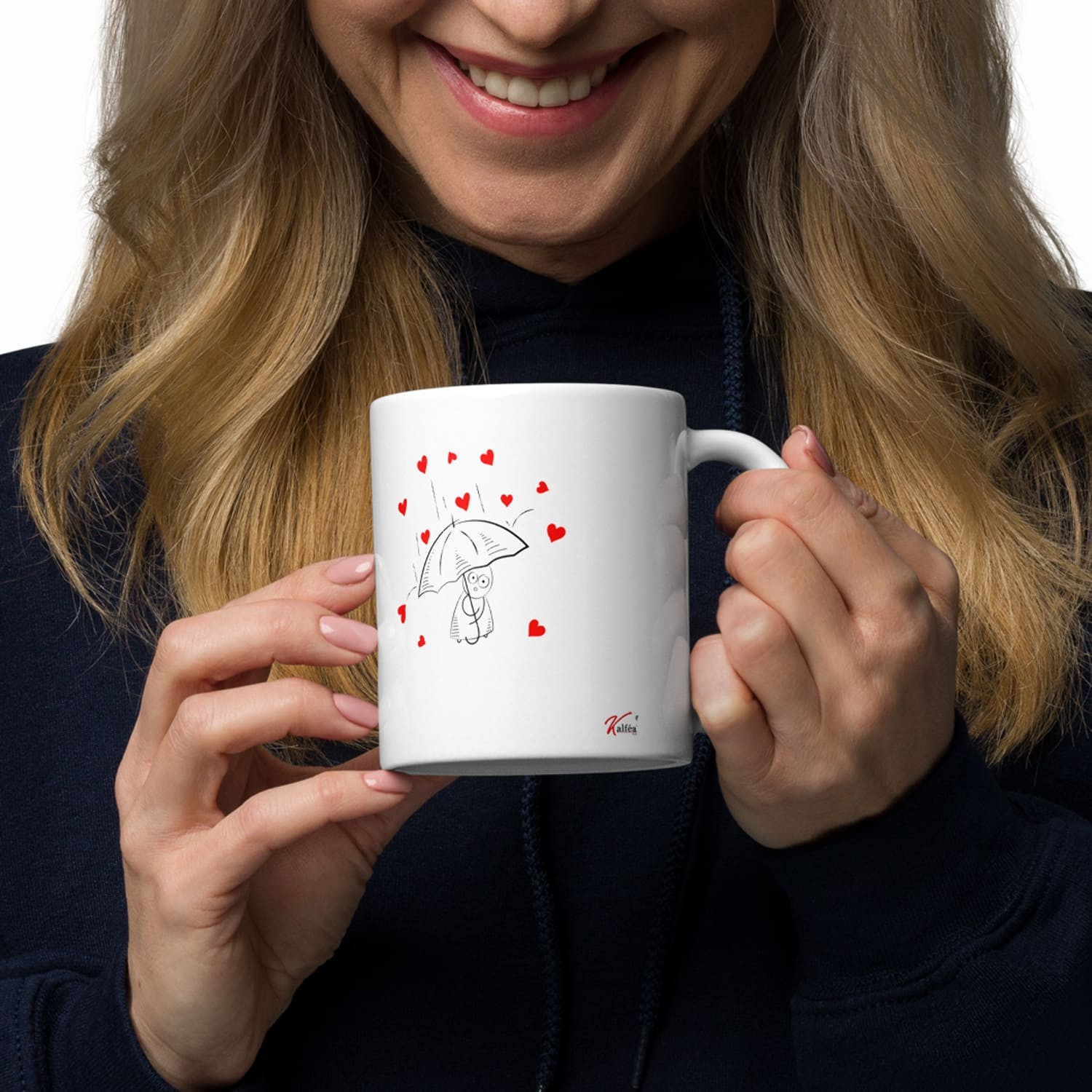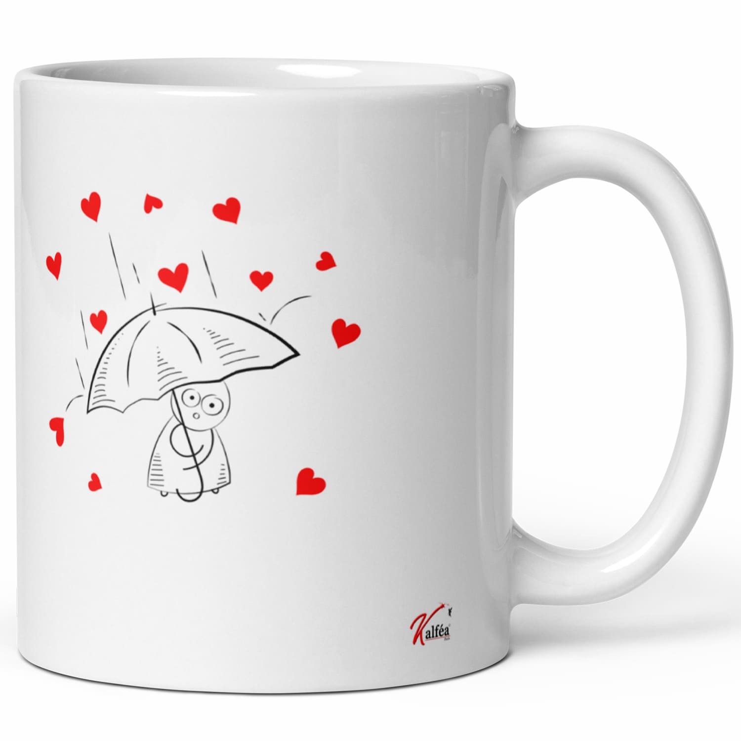 Sur la face arrière, le contraste est total : une pluie de cœurs rouges tombe délicatement sur un parapluie illustré, créant une scène douce et joyeuse. Ce mélange entre l’humour du recto et la poésie du verso donne au mug une personnalité unique, parfaite pour un cadeau d’amitié ou d’amour.